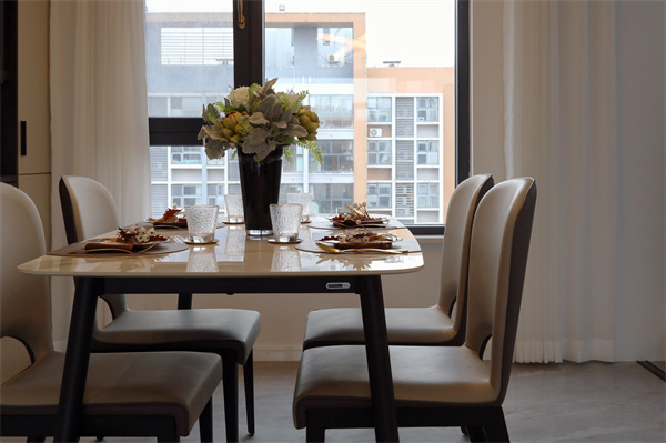 白色巖板臺面的四人餐桌與米色皮質(zhì)餐椅彰顯極簡生活,極致的用餐體驗將在這里展開。
