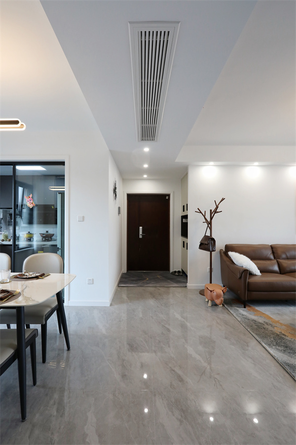 走廊與玄關(guān)相通、對稱,實為一體,筒燈、中央空調(diào)與走廊一同內(nèi)外延伸。