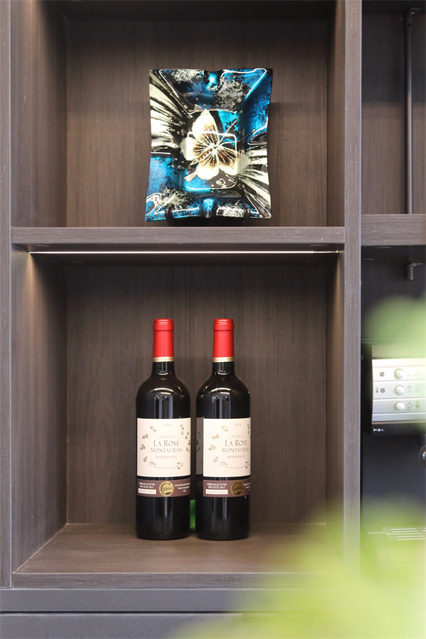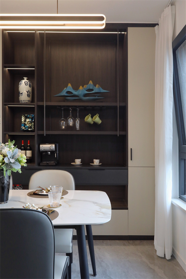 內(nèi)嵌的燈帶使得柜體更加有質(zhì)感,午夜的紅酒與香薰、清晨的咖啡和面包,彼此交織糅合,在這里碰撞出專屬的奇妙。