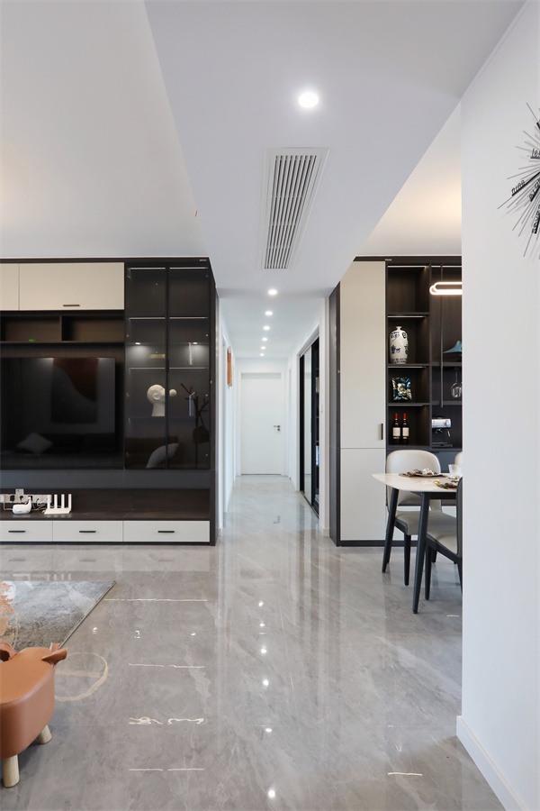 入戶第一眼便是向內(nèi)延伸的走廊,與兩側(cè)相對的茶色透明柜體,通透的柜體與地磚讓人在視覺上感覺十分開闊,入戶的第一感覺,就是大!