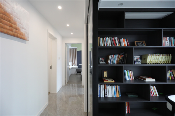 由走廊往里走,第一間便是書房,透明玻璃門,讓書房成為一個半開放式的空間,書柜也成為走廊一景。