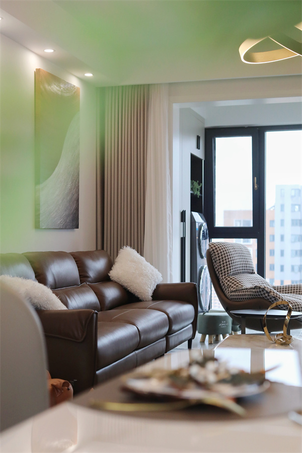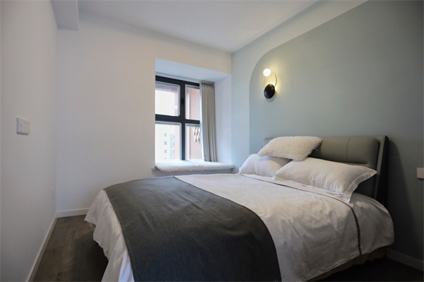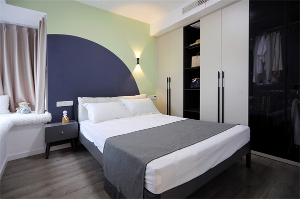客臥床頭背景墻以豆蔻青加薄荷綠的配色,使空間充滿森系天然的沉靜力量。