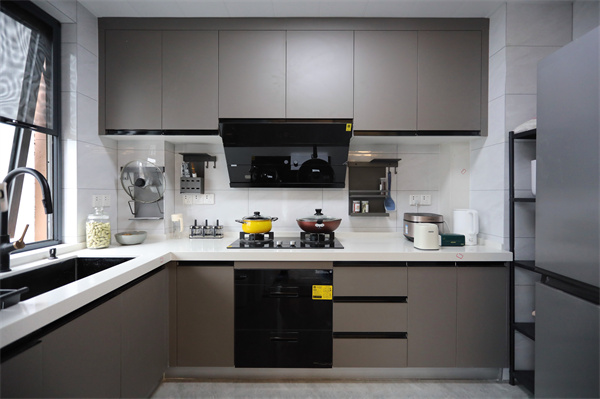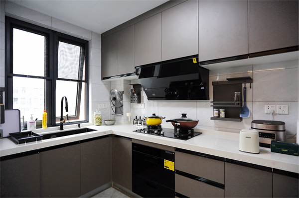 L型的廚房臺面格局讓每個操作區(qū)域動線分明,嵌入式蒸烤箱減少了家電給桌面帶來的雜亂,廚具上墻處理,更使下廚時有條不紊。