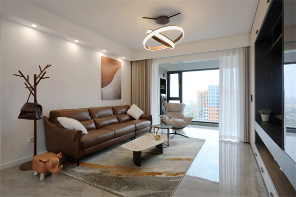 純白的沙發(fā)背景墻搭配流沙裝飾畫,皮質(zhì)沙發(fā)搭配柔軟地毯,靈動橘色與淡雅灰色的色彩碰撞,激蕩出鮮活的氣場。