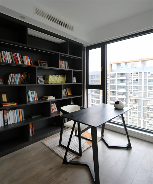 書房以黑白為主,主營造一種莊嚴穩(wěn)重的空間質(zhì)感,一側(cè)的落地窗既滿足書房日常采光,更為走廊填補自然光源的缺失。
