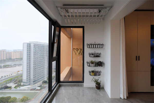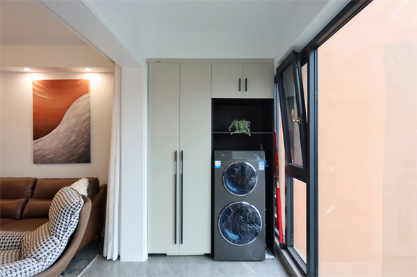 封陽臺做整面落地窗,將采光功能最大化,窗外美景盡收眼底,一側(cè)做功能區(qū),白色收納柜將陽臺雜亂手氣,留空部分嵌入洗烘一體機,增加生活品質(zhì)。
