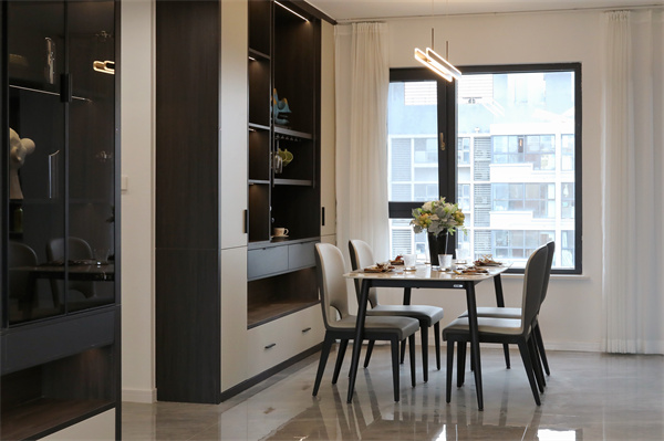 與廚房相對的餐桌另一邊,做了整面的收納柜,一做收納,二做酒柜,三做展示。