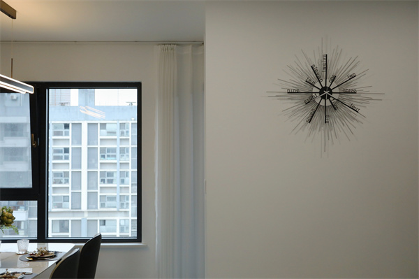 在客廳、餐廳、玄關(guān)的交界處,墻面掛著一個幾何掛鐘,簡單的線條給空間一抹創(chuàng)意的裝扮,呈現(xiàn)出結(jié)構(gòu)分明的秩序感。