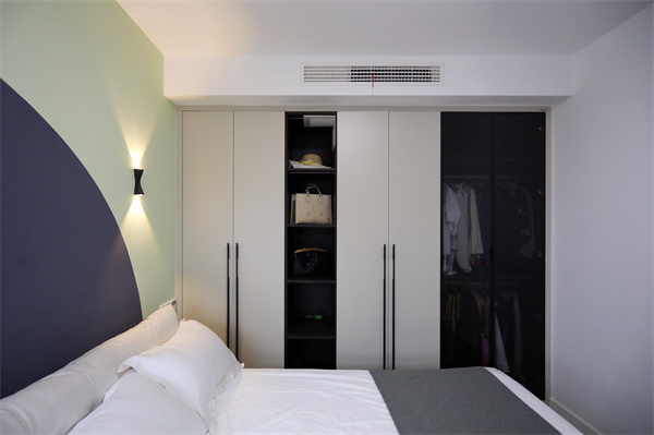 一側(cè)做整面衣柜,頂部不會積灰,收納能力加強,更具有整體性,配色依然以黑白為主,功能以便捷為主。