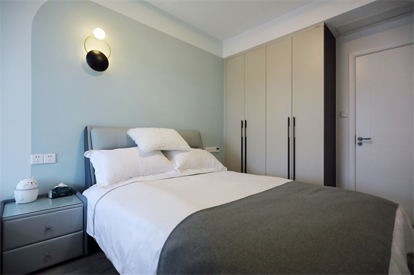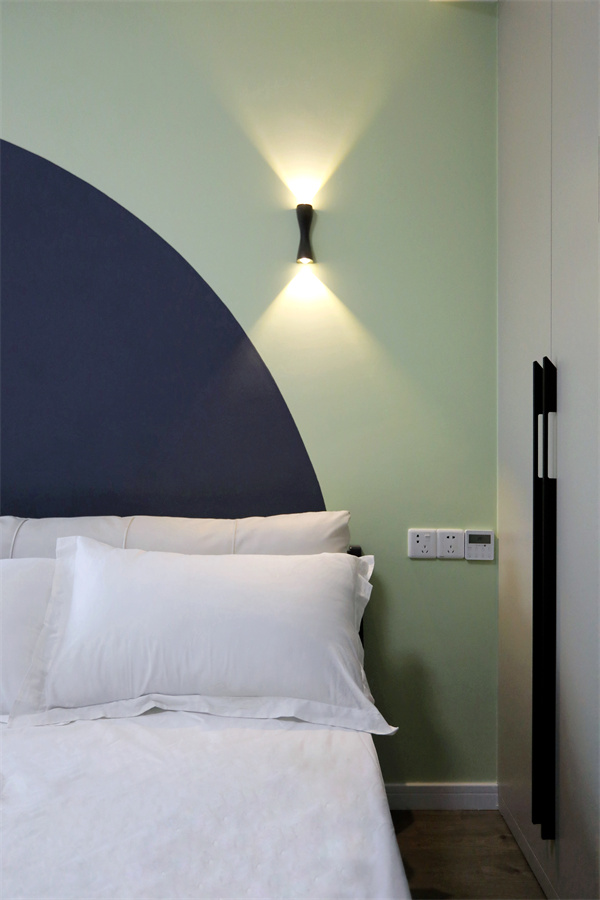床頭一側(cè)做雙頭壁燈,增加氛圍感,夜幕降臨,關(guān)掉主燈,享受小壁燈帶來的片刻靜謐。