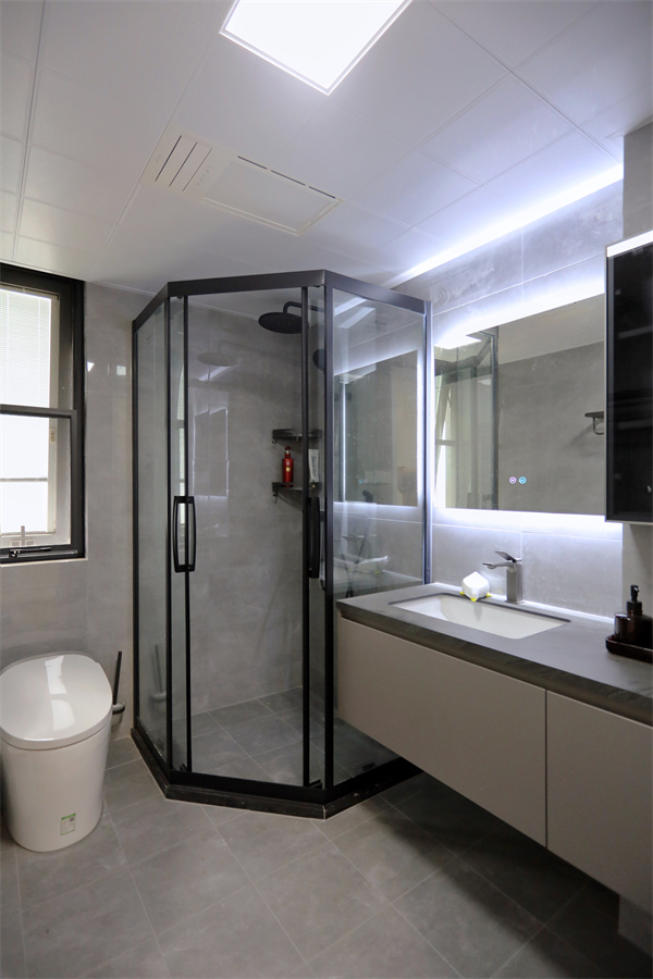 衛(wèi)生間干濕分離設(shè)計,淋浴房玻璃門不影響采光,同色系瓷磚搭配,整潔又經(jīng)典。