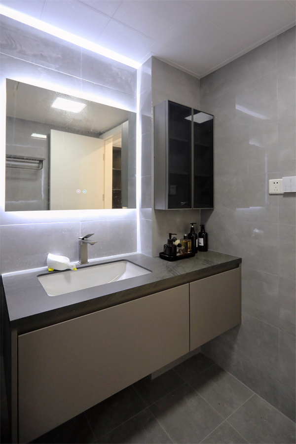 浴室柜懸浮設(shè)計,臺面做嵌入式,便于打掃,簡約的柜門將繁雜收納其中,雙邊燈帶增加空間質(zhì)感。