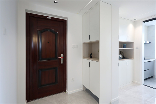 入戶玄關柜底部留空,便于換鞋,柜體正面為玄關柜,背面為餐邊柜,實用與美觀兼顧,賦予空間靈活多變性。