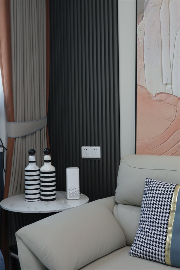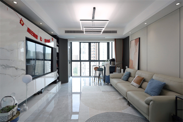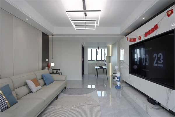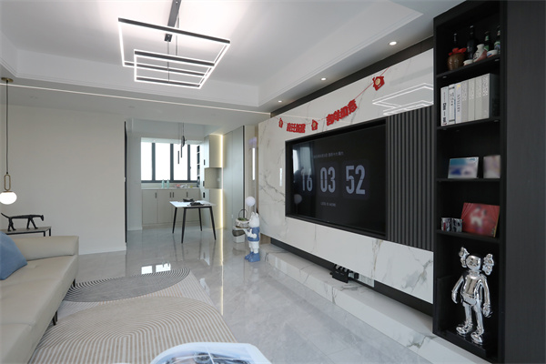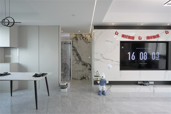 無繁重的吊頂設計,使得空間在視覺上呈現得更大,電視背景墻是石材與沙發背景木飾面的對立結合,也顯得客廳十分有質感。