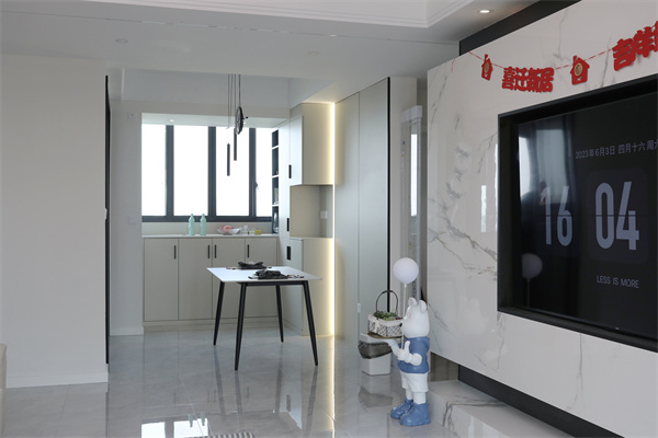 由玄關入內的線性燈與筒燈搭配,提亮整個空間質感,客餐一體的設計,更使空間在視覺上顯大。