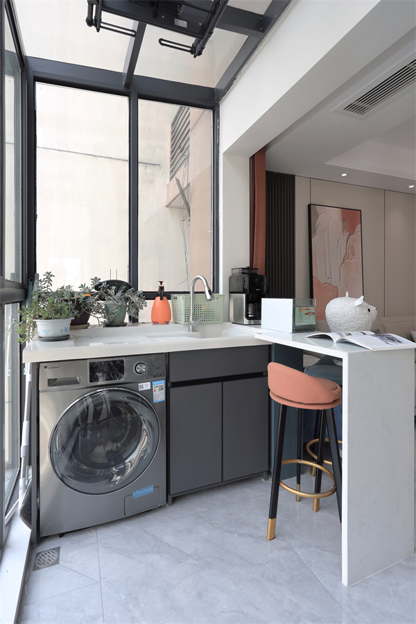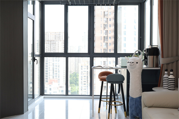 陽臺為開放式陽臺,與客廳為一體,客廳與陽臺間做了一個水吧臺,增加休閑空間。