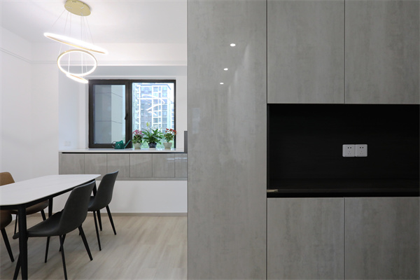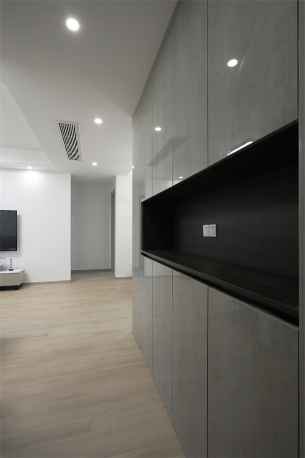 入戶玄關一側做收納柜,將空間充分利用,由長廊入廳,給空間帶來縱深感。