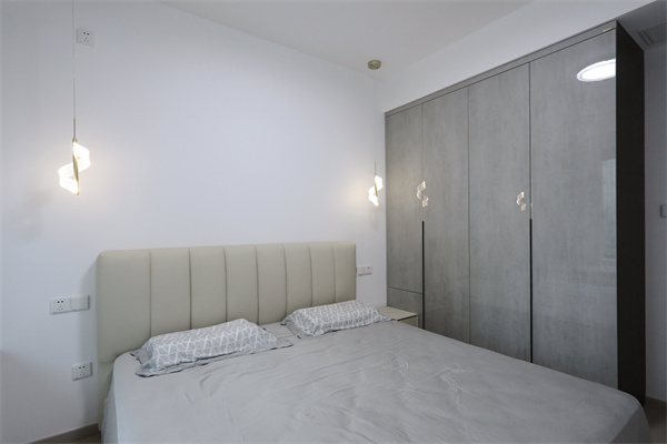 主臥延續整體黑白灰的中心色調,亞克力亮面材質柜門搭配暖光吊燈,使空間十分通透。