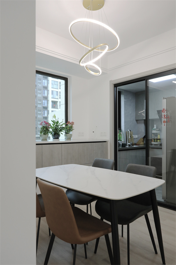 客餐廳一體的設計,保留了足夠的活動范圍,地面通鋪地板,創造不急不躁的空間氛圍。