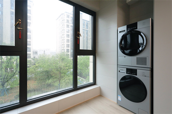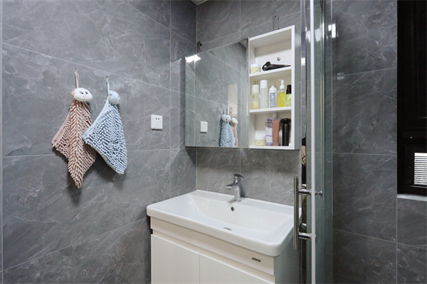 轉角圓弧形淋浴房使衛生間干濕分離,自帶小窗加強空間通風,整體空間色調統一。