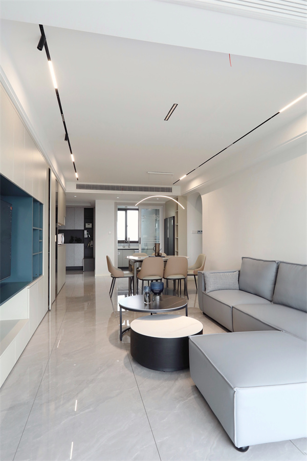 客餐廳于一體,電視柜與餐邊柜相連,整體區域無主燈,餐廳設置局部燈光。