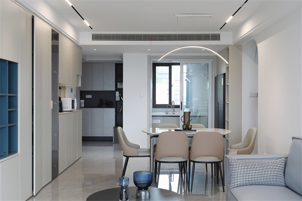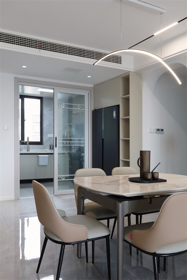 而由內向外的走廊通道,正對餐邊柜,線面與燈光,給人曲徑通幽處的延伸感。