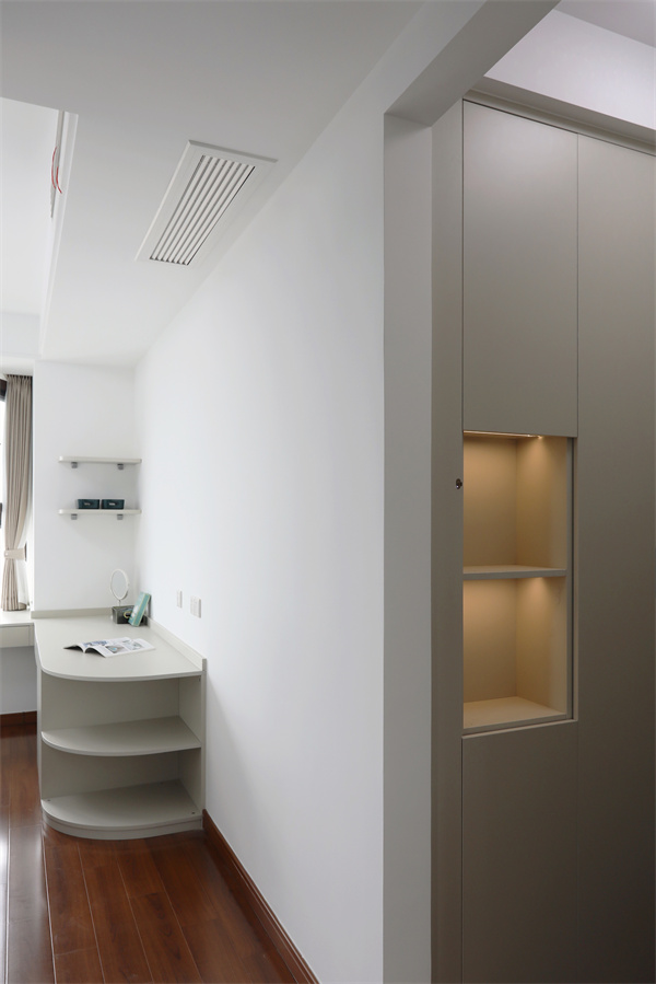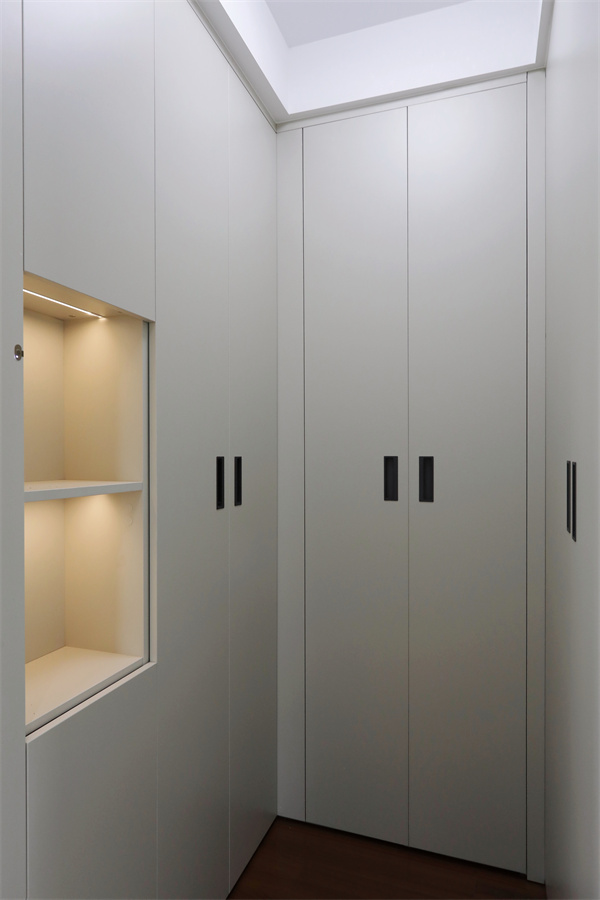 U型衣帽間滿足衣物收納,留空的開放格部分內嵌線性燈,烘托細膩質感。