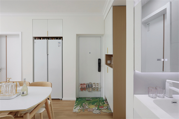 玄關(guān)柜立于入戶一側(cè),作為進門時的緩沖空間。