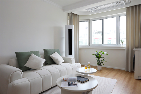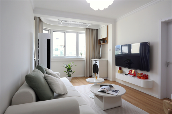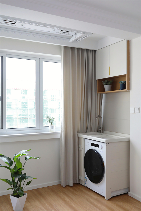 陽臺空間的寬度與客廳整體一致,在保留原有的自然采光的情況下,增加洗衣晾曬功能。