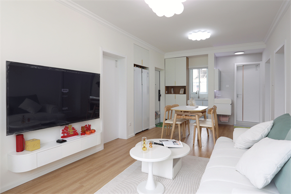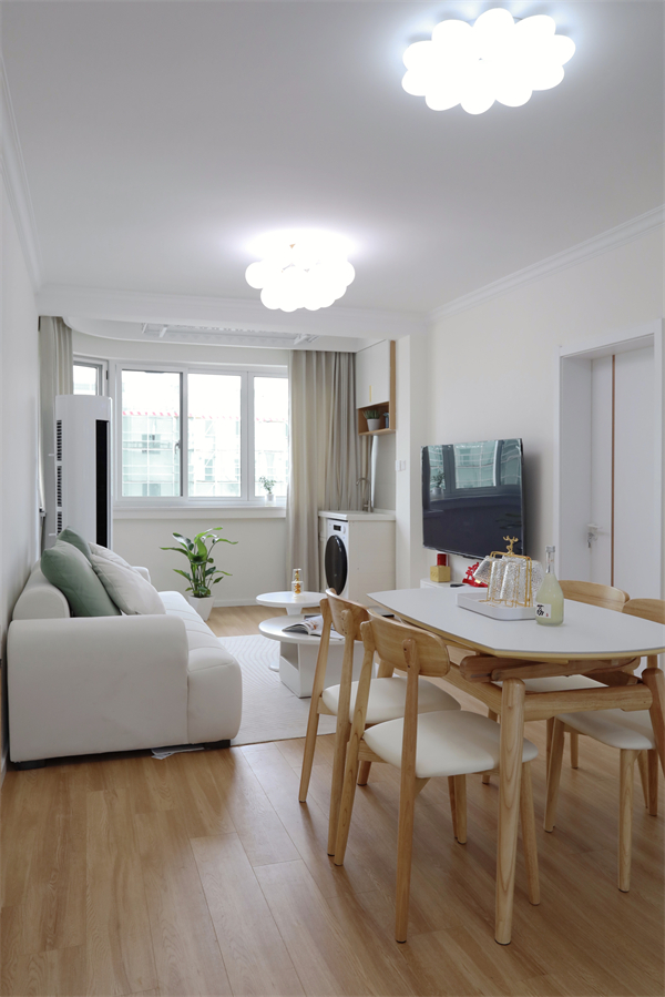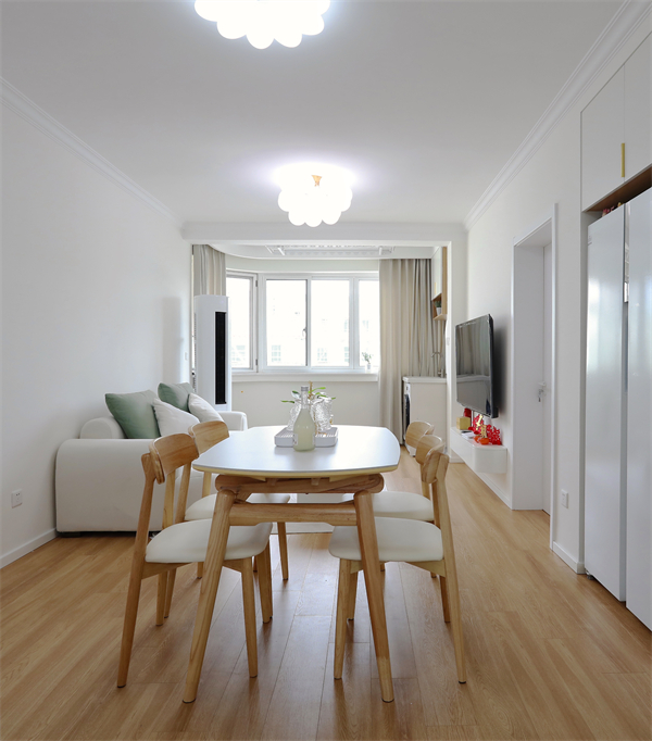 整體戶型為三室一廳,留給外部的活動空間不大,因此客餐廳一體是最合適的設(shè)計。