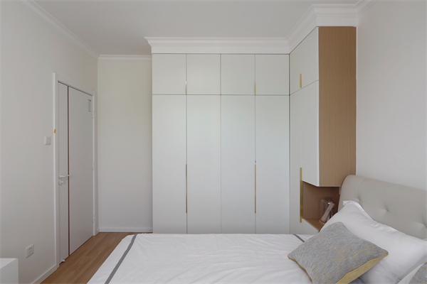 L型衣柜兼顧床頭柜功能,衣柜頂部以吊頂填充,增加空間整體性。