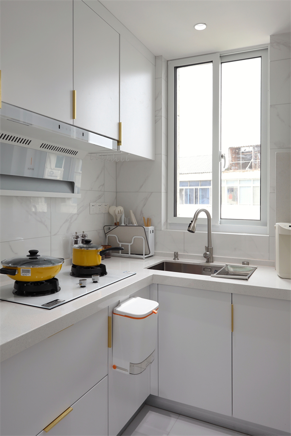 廚房空間則是根據(jù)原戶型的能用空間以及業(yè)主的動線需求,做L型廚柜。