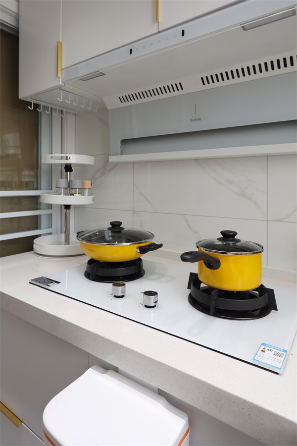 定制吊柜與煙機高度一致,足夠的收納,使臺面整潔干凈。