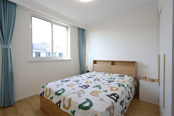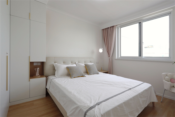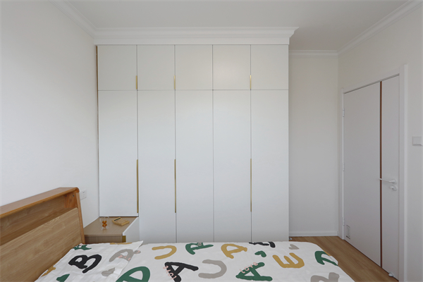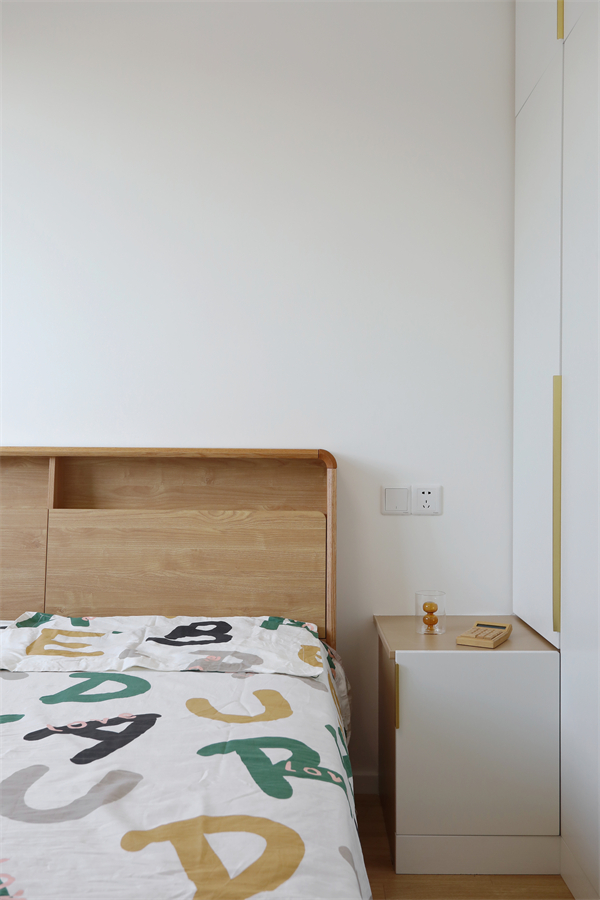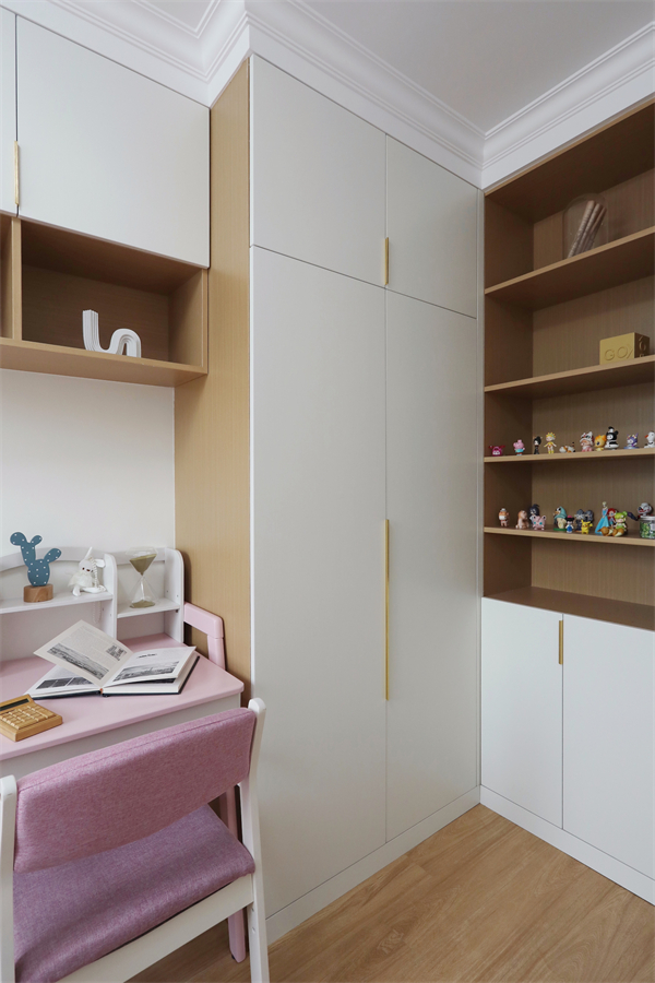 一側(cè)床頭柜與定制衣柜一體,豐富空間功能,床頭開放格可以放置小玩偶陪伴孩子入睡。