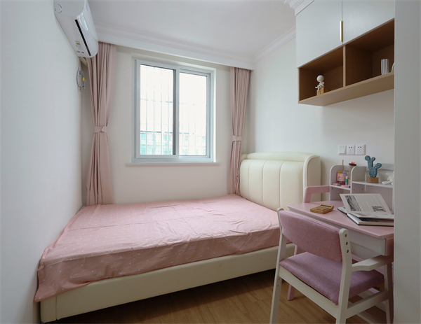 女兒房硬裝依然以木色與白色為主,在軟裝上利用粉色來裝飾空間。