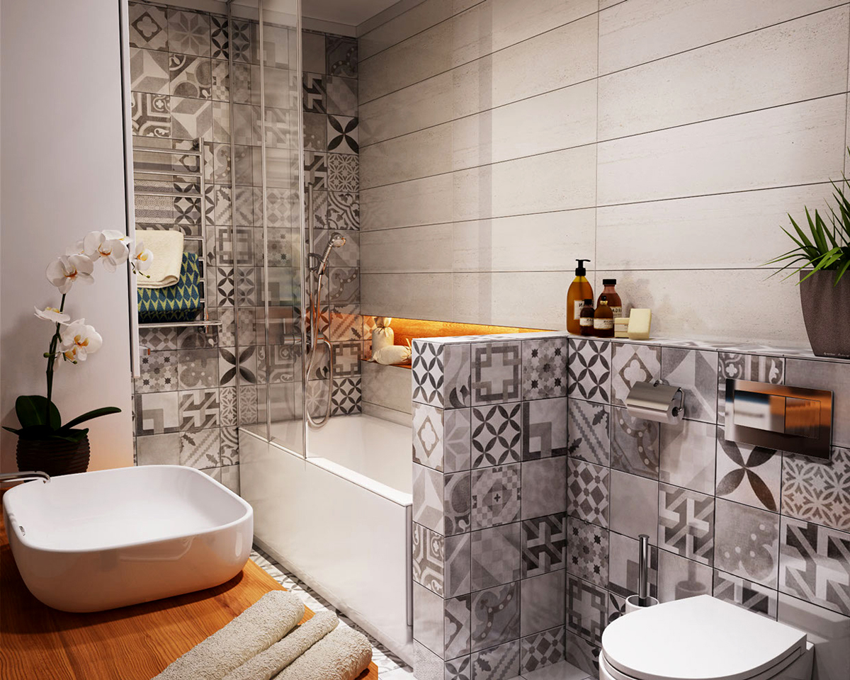 浴缸一端做半墻隔斷,瓷磚在灰色的主色調(diào)上搭配部分花磚,使衛(wèi)生間不再沉悶單調(diào)。