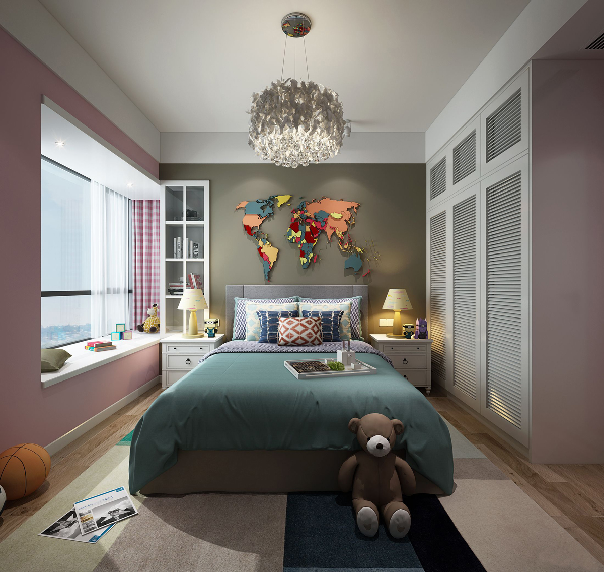 清新色調(diào)的兒童房,格柵衣柜門板,舒適而愜意。